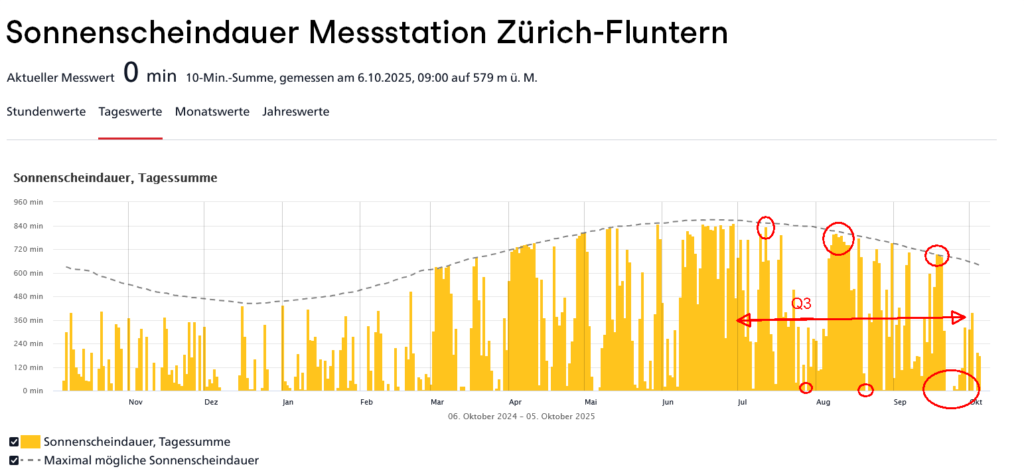 Das dritte Quartal 2025 zeigte sich beim Sonnenangebot wie eine Achterbahnfahrt. Auf einige sehr sonnige Tage und kurze gute Phasen folgten längere, trübe Perioden mit kaum oder gar keinem Sonnenschein – Verhältnisse, wie man sie sonst eher zwischen November und Februar erwartet (siehe markierte Bereiche im Bild).
