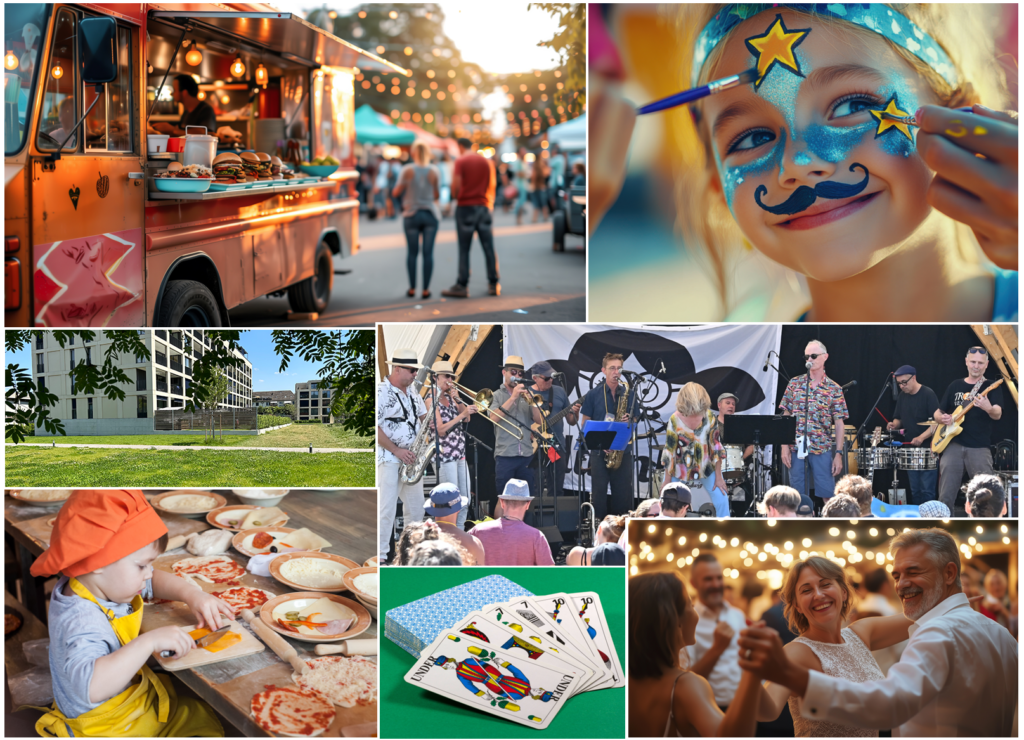 - Kinder-Animation (Spiele auf der Wiese, Kleinkinder-Parcours, Gratis-Sirup, Schminken, usw.)
